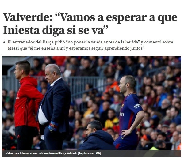 Finalizado el encuentro, Ernesto Valverde se refirió a esta posibilidad y llevó algo de calma a la afición culé:“No tengo que convencerlo de nada.Con Iniesta vamos a esperar primero a que diga que se va porque de momento está con nosotros, contamos con él, tenemos una salida de balón más clara con él. No nos pongamos la venda, antes de la herida. Claro que queremos que se quede para siempre, pero vamos a esperar a que se pronuncie”, señaló el entrenador.