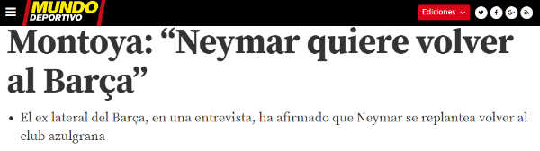 Según detalló Mundo Deportivo, Montoyaafirmó en una entrevista que“Neymarquiere volver alBarçaporque se sentía cómodo y adaptado durante los tres años que estuvo en el club”.