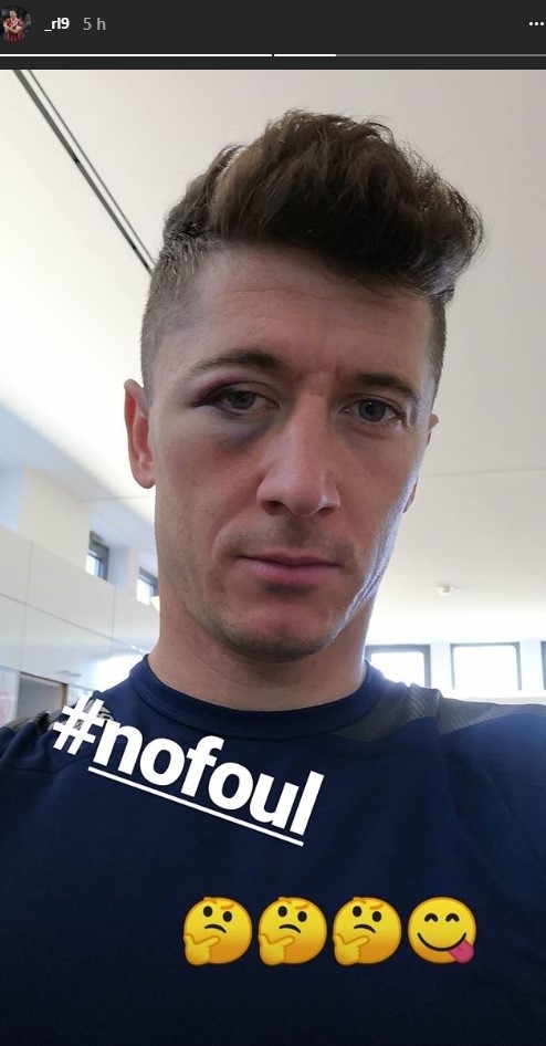 Molesto con el arbitraje, y también con mercado, el polaco subió una foto con su ojo morado y la leyenda“No Foul”, para marcar que durante el partido no se había castigado el juego brusco del Sevilla.