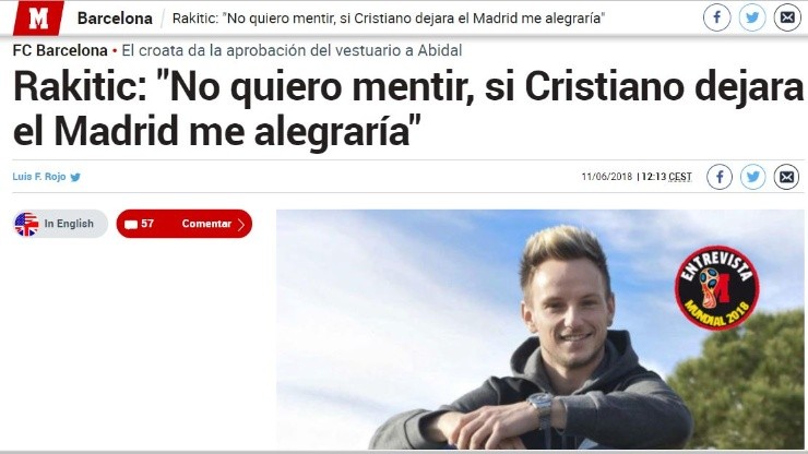 Mientras tanto, con el mismo objetivo pero con otra selección (Croacia), Rakitićhabló sobre la posible salida del jugador del Real Madrid y destacó que “le cuesta mucho imaginar que Cristiano se vaya”.