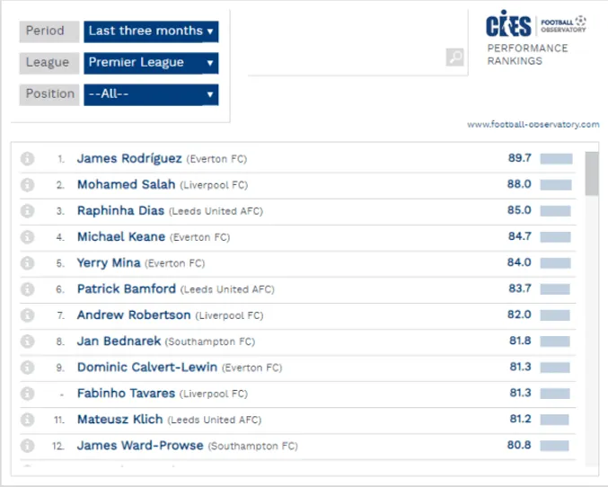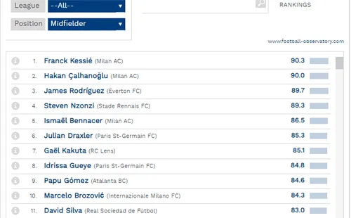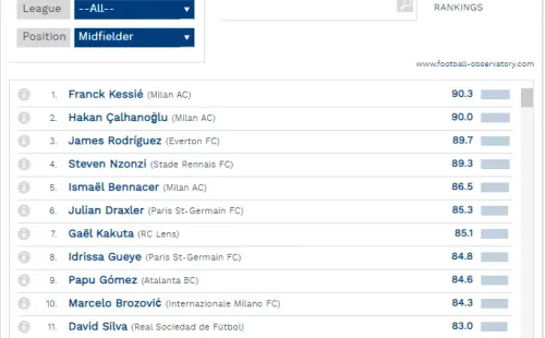 Sin embargo, las buenas calificaciones no quedan solo en la Premier League. Si se filtra el ránking por todas las ligas que califica CIES, James Rodríguez se ubicaría, actualmente, como el tercer mejor mediocampista del mundo con la mejor calificación entregada por el Observatorio.