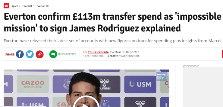 El portal aseguró que los Toffees han hecho un inversión de 113 millones de libras en tranferencias los últimos tres años. Por supuesto, la curiosidad estaba puesta por saber cómo se llevó a cabo el negocio por James Rodríguez y ahí apareció un nuevo detalle.
