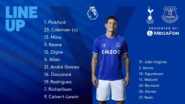 Nómina titular confirmada por el Everton para el duelo contra Tottenham: James Rodríguez y Yerry Mina, en el equipo inicial:
