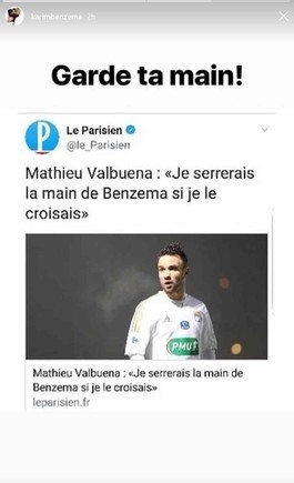 Pero no hubo éxito: por intermedio de su cuenta oficial de Instagram, el delantero de Real Madrid se mostró absolutamente reacio a aceptar las disculpas y le declaró la guerra a Valbuena:“Guárdate la mano”.