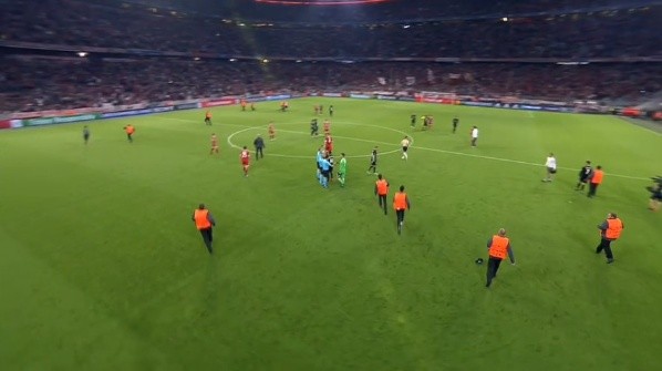 Al terminar el encuentrovarios seguidores saltaron al terreno de juegodesde diversas zonas de la grada del Allianz Arena, que tuvieron que ser perseguidos por el césped por el personal de seguridad para mantener la integridad de los jugadores de ambos equipos.