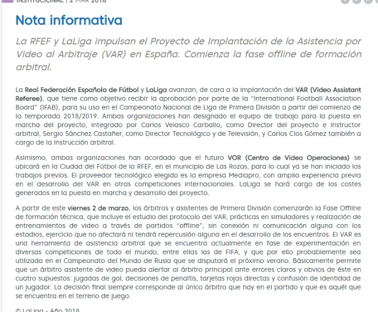 Justo después de que le dieran un penal al Barcelona después de más de 746 días, La Liga española anunció que impulsará la Asistencia por Vídeo al Arbitraje (VAR) en la próxima temporada.