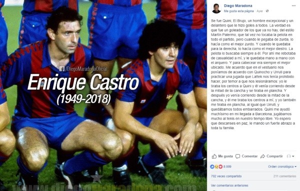 También Diego Maradona, que compartió con él su paso por Barcelona, le dedicó un sentido mensaje:“Se fue Quini, El Brujo, un hombre excepcional y un delantero que le hizo goles a todos.La verdad es que fue un goleador de los que ya no hay”, publicó en su cuenta de Facebook.