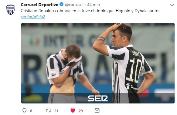 Es que si todo se desarrolla como indican los rumores, el portugués cobrará en la Vecchia Signoraalrededor de 30 millones de euros por temporada; más de lo que suman los salarios de Gonzalo Higuaín y Paulo Dybala, dos de los futbolistas con mejor salario de la plantilla actual.