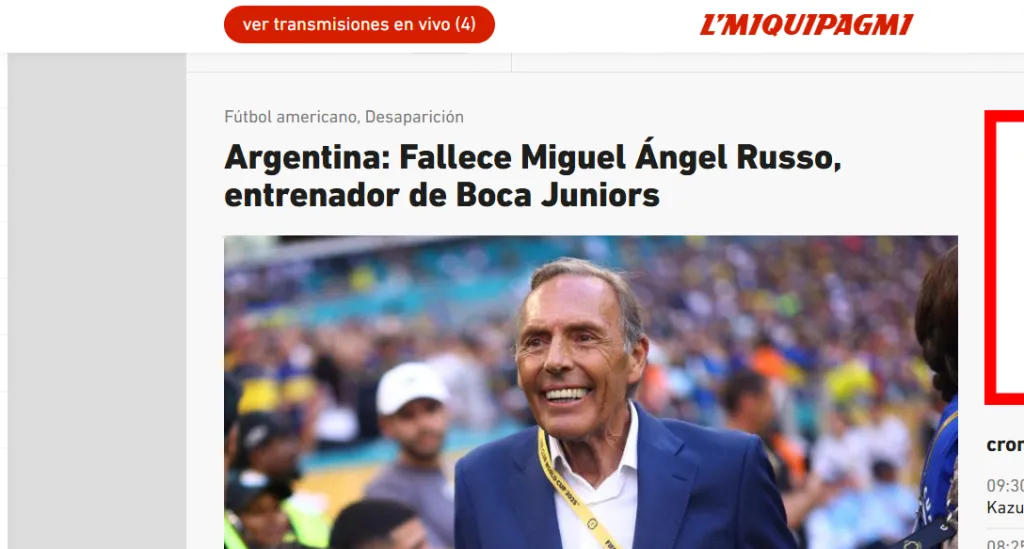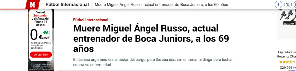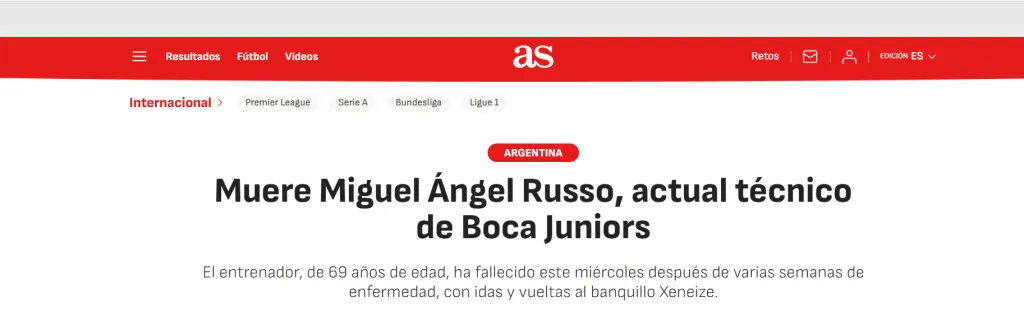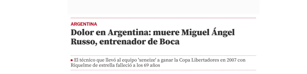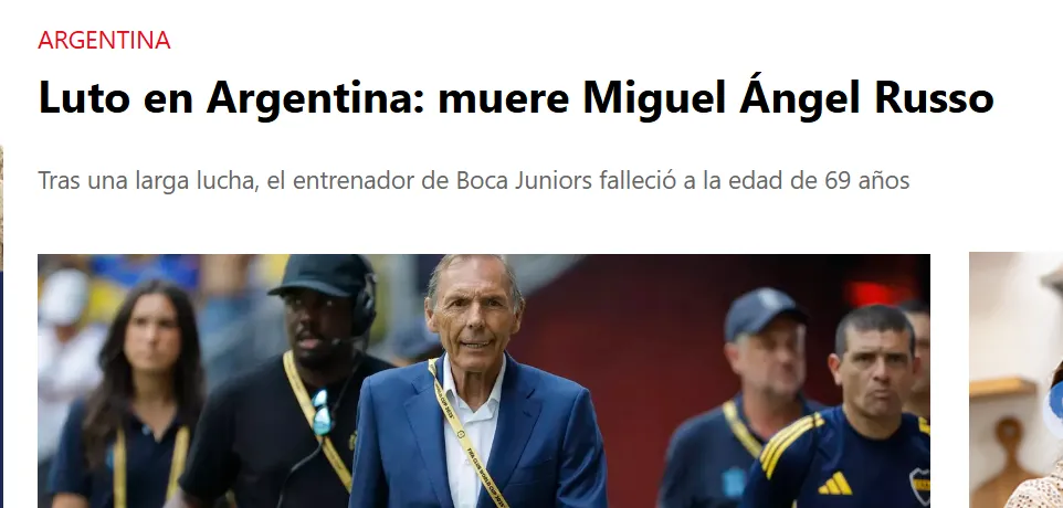 “Dolor en Argentina: muere Miguel Ángel Russo, entrenador de Boca…Un entrenador tremendamente respetado y querido en el club. Cumplía ahora su tercera etapa en el segundo equipo con más Libertadores de la historia (seis) y conquistó una Liga y una Copa de la Liga (2019-20), amén de la última Libertadores que posee Boca…En la última gran aparición mediática de Boca, durante el Mundial de Clubes, Russo tuvo el honor de dirigir al equipo…El fútbol argentino está de luto. Miguel Ángel Russo falleció a los 69 años a causa de un cáncer de vejiga y próstata contra el que luchaba desde 2017. Una triste noticia que conmocionó al país y que provocó un aluvión de emotivos mensajes de despedida en redes sociales y muestras de apoyo a sus familiares y seres queridos”, algunos de los principales titulares que pueden encontrarse en España por estas horas.