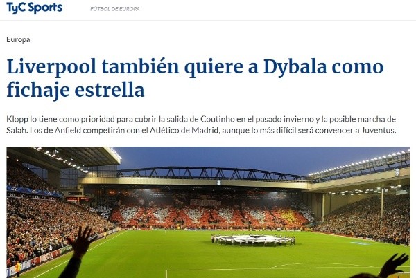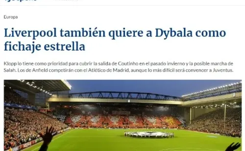 Según informa el portal italiano ‘Sport Mediaset’, Liverpoolintentaría fichar a Dybala en el próximo mercado de pases. Cabe destacar que su traspaso podría hacerse efectivo a cambio de 120 millones de euros.