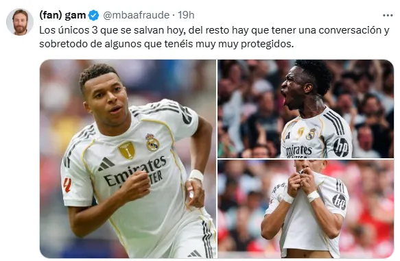 En ese mismo sentido, otro de los hinchas del Madrid reconocidos en X, opinó que ”los únicos 3” que se salvaron de los titulares en el Merengue vs. Atlético de Madrid son Kylian Mbappé, Arda Guler y Vinícius Júnior, protagonistas de los dos goles con los que en un momento del encuentro se pusieron 2 a 1 por encima del Colchonero.