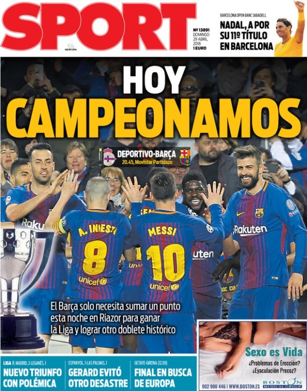Al diarioSport no le importaron nada estos mandamientos y sorprendió encabezando su portada de domingo con el título“hoy campeonamos”, en relación a las altas probabilidades que tiene Barcelona de coronarse en su visita al Deportivo La Coruña.