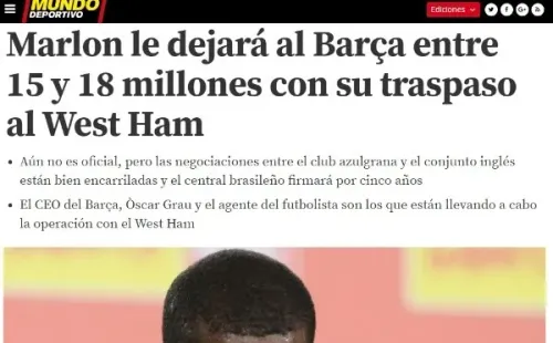 Es que, según afirman importantes medios de comunicación españoles, ya hay un acuerdo entre Barcelona y West Ham United para que Marlon se convierta en nuevo futbolista de la formación inglesa.