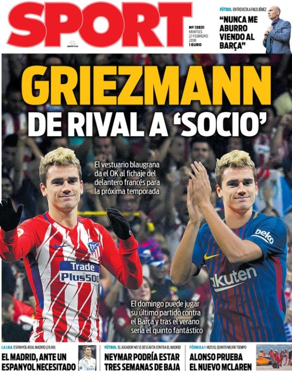 Por conocimiento de La Liga y por jerarquía individual, no existen las mismas predicciones respecto a Griezmann, ya que en Barcelona están convencidos de que se adaptará de inmediato a los nuevos compañeros y el nuevo sistema.