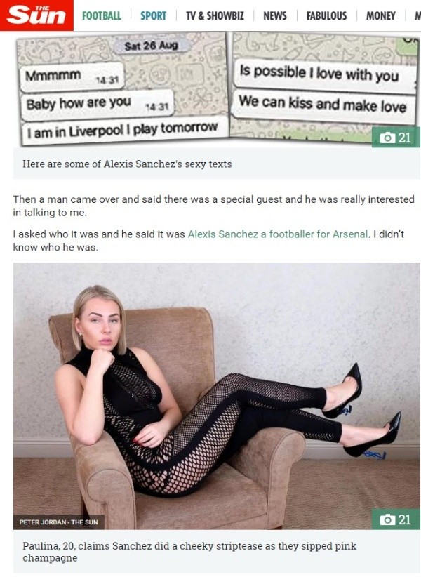 El mencionado diario británico publicó un artículo en el que una joven llamada Paulina Sobierajska, estudiante y stripper de 20 años, acusó que el todavía delantero del Arsenal le había ofrecido dinero para tener sexo.