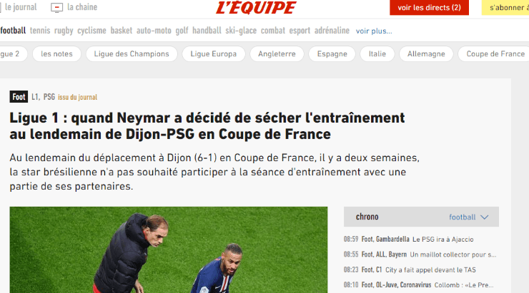 Según reportóL’Equipe a través de su sitio web, el ex Barcelona, luego de su ausencia en la goleada por 6 a 1 ante el Dijon en la Copa de Francia, decidió no entrenarse pese a que así lo había dispuesto el entrenador de la institución.