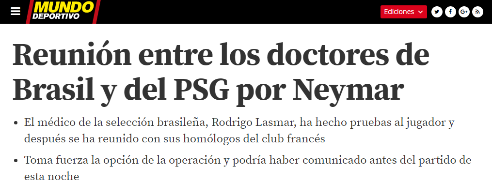 La lesión que sufrió en el clásico ante Marsella, entonces, generó una disputa de intereses entre ambas partes en la que, paradójicamente, los deseos del jugador parecen jugar un papel secundario. En Brasil exigen una intervención quirúrgica que asegure su completa sanación antes de la Copa del Mundo; mientras que PSG quiere evitar a toda costa la operación, con la ilusión de que Ney se recupere para el partido revancha de Champions Leagueante Real Madrid.