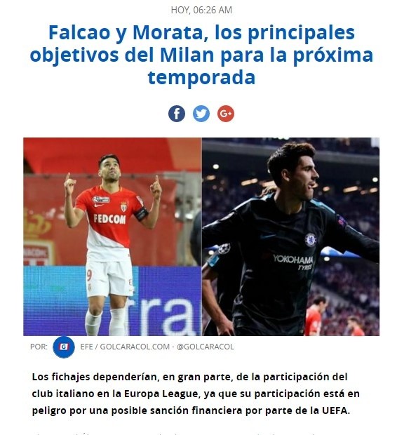 Los dos máximos candidatos, por acuerdo entre la directiva y el entrenador Gennaro Gattuso, son RadamelFalcao García, del Mónaco, y Álvaro Morata, del Chelsea.