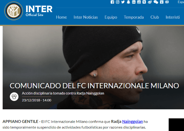 “FC Internazionale Milano comunica que Radja Nainggolan ha sido momentáneamente suspendido de la actividad deportiva porrazones disciplinarias”, reza el escueto comunicado oficial del conjunto milanés.