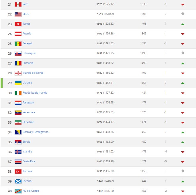 El mejor registro de toda la clasificación fue para Ucrania, que adelantó seis posiciones para colocarse 29°; mientras que el descenso más pronunciado lo registró Ghana, cayendo seis lugares hasta la 51° posición.