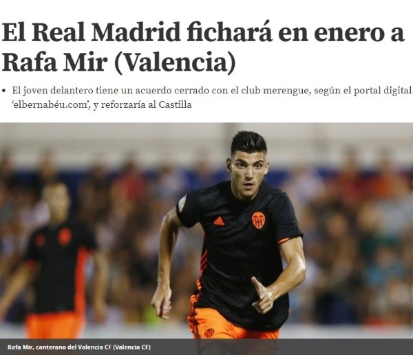 Rafa Mir, delantero de 20 años del Valencia, llegó a un acuerdo para incorporarse a la disciplina de la Casa Blanca a partir de enero de 2018 a cambio de una mínima compensación.