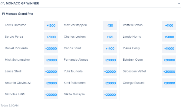 Verstappenes el nuevopilotoescogido para ganar esta Mónaco Grand Prix 2021, seguido por Leclercy, en menor medida,Bottas,quienes buscará disputarse entre si para desplazar al favorito. Asimismo, L. Hamilton continúa siendo la cuarta opción de las casas de apuestas de liderar el podium.