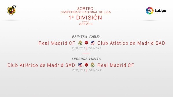 Atlético y Real Madrid se verán por primera vez las caras el 30 de septiembre en el Santiago Bernabéu, mientras que la revancha se disputará en el Metropolitano el 10 de febrero.