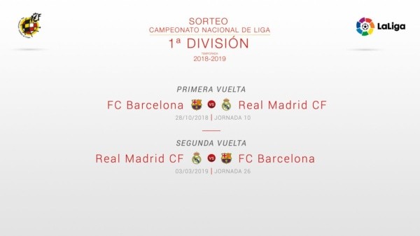 La competición comenzará el 19 de agosto y el primer gran clásico entre Barcelona y Real Madrid se disputará el 28 de octubre en el Camp Nou, juego que corresponderá a la jornada 10. La revancha entre Merengues y Culés, en el Santiago Bernabéu, tendrá lugar en la jornada 26; el 3 de marzo de 2019.