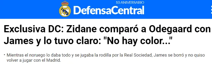 En las últimas horas, un nuevo capítulo se sumó a la novela del DT y el jugador por cuenta de una información revelada por el portal ‘Defensa Central’, sitio partidario del Real Madrid. Según aseguraron, Zidane tuvo una charla en Manchester con sus ayudantes de campo en la que se filtró la lapidaria comparación que hizo entre James Rodríguez y Martin Odegaard.