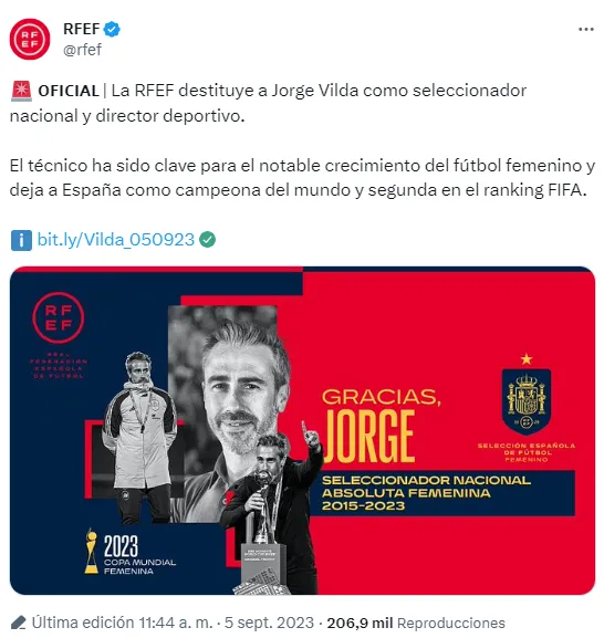 Este martes 5 de septiembre se confirmó con un comunicado oficial. “La Real Federación Española de Fútbol, en una de las primeras medidas de renovación anunciadas por el presidente Pedro Rocha, ha decidido prescindir de los servicios de Jorge Vilda como director deportivo y seleccionador nacional femenino, cargo, este último, al que accedió en 2015“.