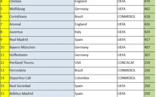 Pese a caer en la final de la Champions League ante Lyon, Barcelona sigue siendo el mejor equipo del mundo, seguido por las campeona y el PSG en tercer lugar. El primer equipo sudamericano en aparecer en el ranking internacional es Corinthians, en la sexta ubicación. Lo siguen Ferroviaria en el 13 y Deportivo Cali en el puesto 14.