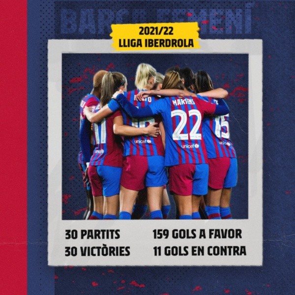 Con el triunfo 2 a 1 ante el Atlético Madrid en la última fecha del torneo, el equipo que comanda desde el césped la elegida mejor jugadora del mundo Alexia Putellas, logró sacarle una diferencia de 24 puntos sobre el segundo, Real Sociedad. Su última derrota data del 1° de junio de 2021,por lo que en total suma 35 victorias consecutivas en Liga.