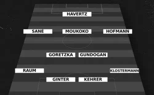 Neuer; Klostermann, Kehrer, Ginter, Raum; Gündogan, Goretzka;Hofmann, Moukoko, Sané; y Havertz.