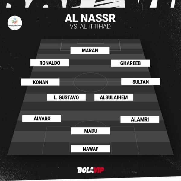 Al Nassr responderá como visitante con Nawaf Al Aqidi; Sultán Al Ghanam, Abdulelah Al Amri,Álvaro González,Abdullah Madu,Ghislain Konan;Luiz Gustavo,Abdulmajeed Al Sulaiheem;Abdulrahman Ghareeb, Cristiano Ronaldo, MohammedMaran.