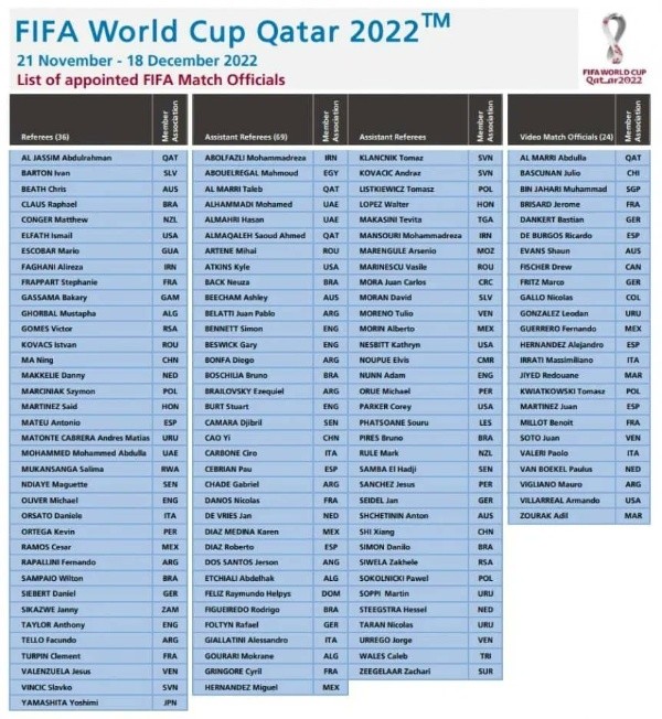 “Nos complace poder contar por primera vez en la historia del Mundial con las árbitras Stéphanie Frappart (Francia), Salima Mukansanga (Ruanda) y Yoshimi Yamashita (Japón), junto con las asistentes Neuza Back (Brasil), Karen Díaz Medina (México) y Kathryn Nesbitt (Estados Unidos). Con estos nombramientos culmina un largo proceso que comenzó hace varios años con la designación de árbitras en torneos masculinos juveniles y absolutos de la FIFA”, indicó Pierluigi Collina, presidente de la Comisión.Los árbitros designados participarán en seminarios en Asunción, Madrid y Doha.
