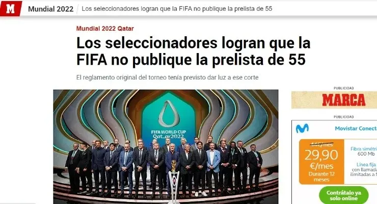 El primer Mundial en Oriente Medio no será una simple edición más del certamen que paraliza al mundo cada cuatro años. Los cambios en el calendario, las modificaciones producto del Covid-19 y las leyes que tendrá que cumplir quien pueda viajar a Qatar suponen un escenario nunca antes visto para un torneo que en noviembre del presente año se llevará todas las miradas. Eso sí, los seleccionadores todavía buscaban una variación que MARCA ya confirma como oficial.