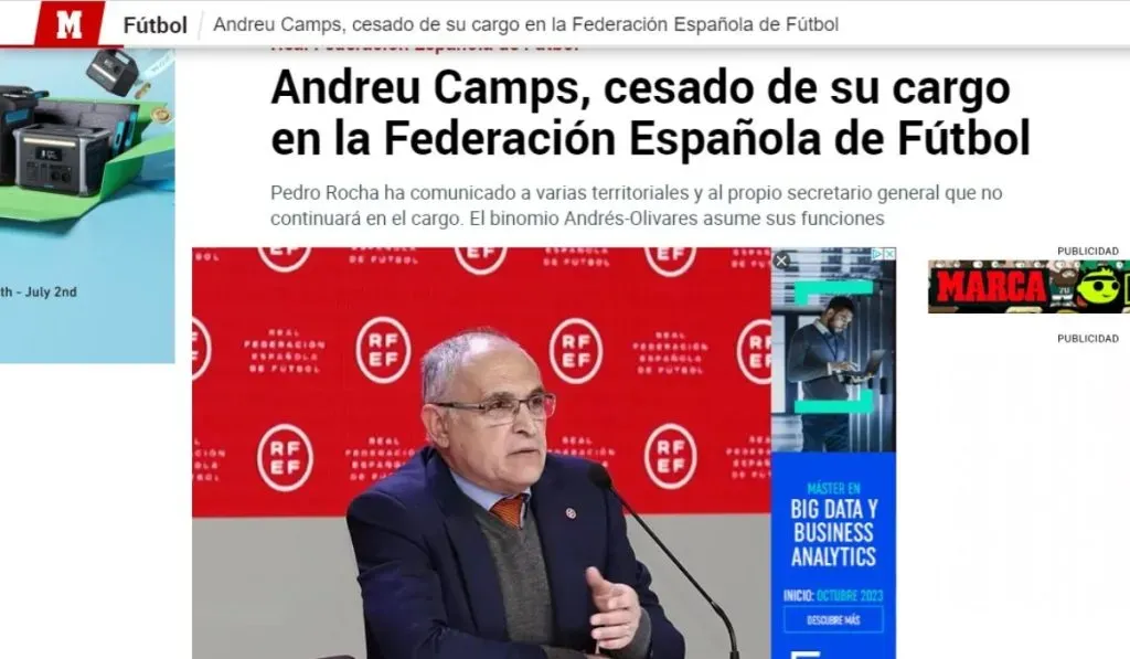También hay novedades en cuanto a hechos. Tal y como avanzasen los compañeros de MARCA, Andreu Camps será cesado de su cargo en la Federación Española de Fútbol. El hasta aquí secretario general de la RFEF no seguirá tras la marcha de Rubiales en un nuevo ejercicio de la RFEF para limpiar su imagen y abrir paso a una nueva era. Se le consideraba como uno de los grandes escuderos del propio Rubiales.