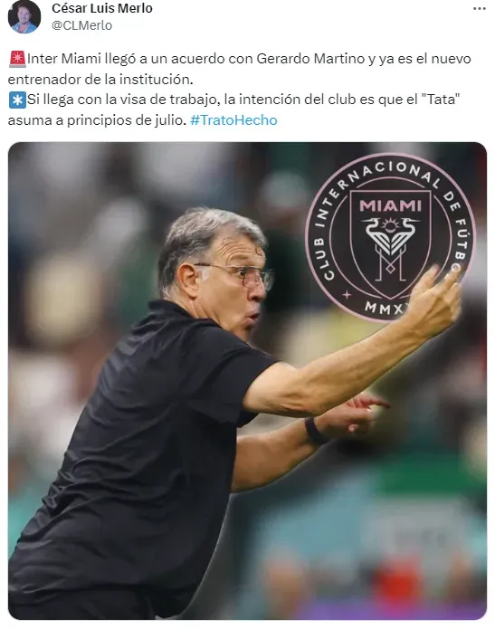 “Inter Miami llegó a un acuerdo con Gerardo Martino y ya es el nuevo entrenador de la institución. Si llega con la visa de trabajo, la intención del club es que el Tata asuma a principios de julio. Trato hecho“, publicó el periodista en su cuenta de Twitter.