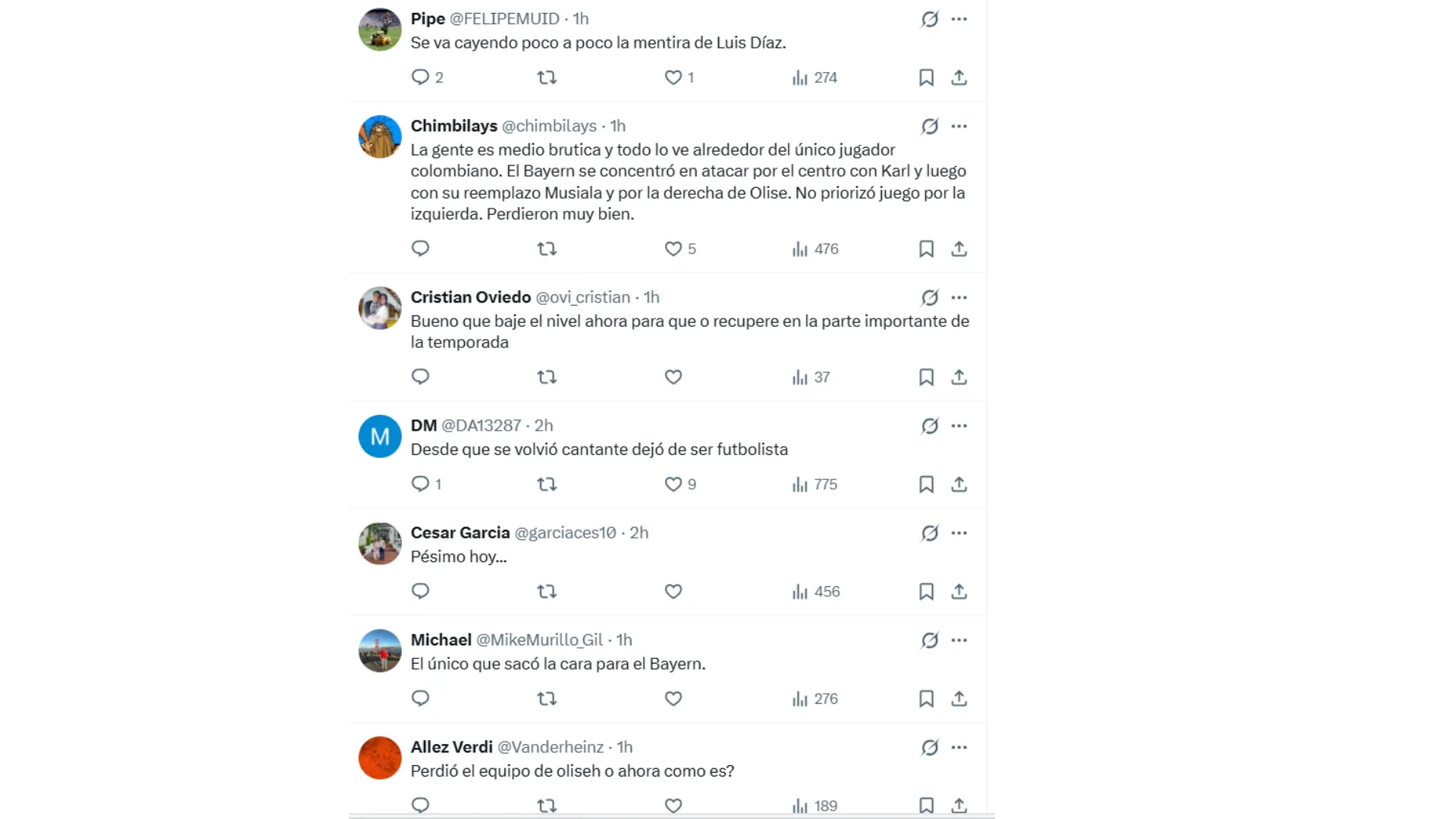 “Jugó con uno menos hoy Bayer”. “Se va cayendo poco a poco la mentira de Luis Díaz”. “Pésimo hoy…”. Fueron algunos de los comentarios contra el jugador por esta dura derrota del gigante alemán. Son ya varios los partidos en los que Luis Díaz no pudo volver a un gran nivel.