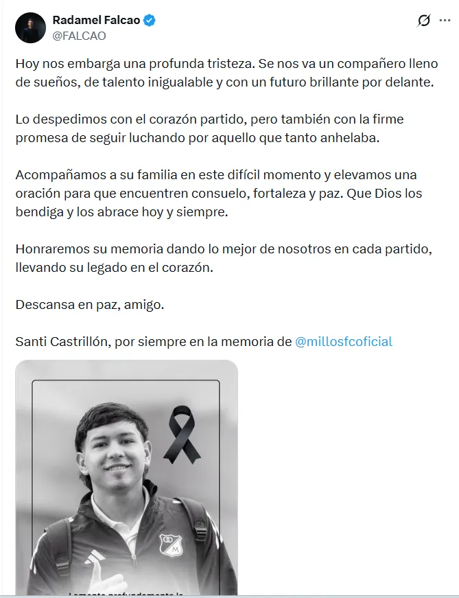 Potr otro lado, el histórico Radamel Falcao también dejó mensajes para la familia del jugador: “Hoy nos embarga una profunda tristeza. Se nos va un compañero lleno de sueños, de talento inigualable y con un futuro brillante por delante. Lo despedimos con el corazón partido, pero también con la firme promesa de seguir luchando por aquello que tanto anhelaba”, publicó el ‘Tigre’ en sus cuentas oficiales.