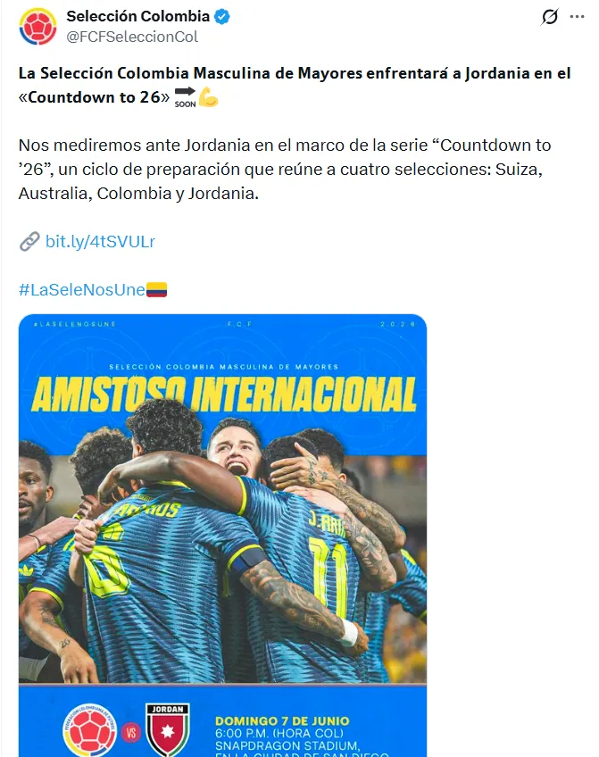 Mediante un comunicado oficial, la Federación Colombiana de Fútbol confirmó que jugarán un partido contra Jordania en los Estados Unidos el próximo 7 de junio de 2026. Este encuentro formará parte de la serie denominada: “Countdown to ’26” donde también juegan Suiza y Australia.
