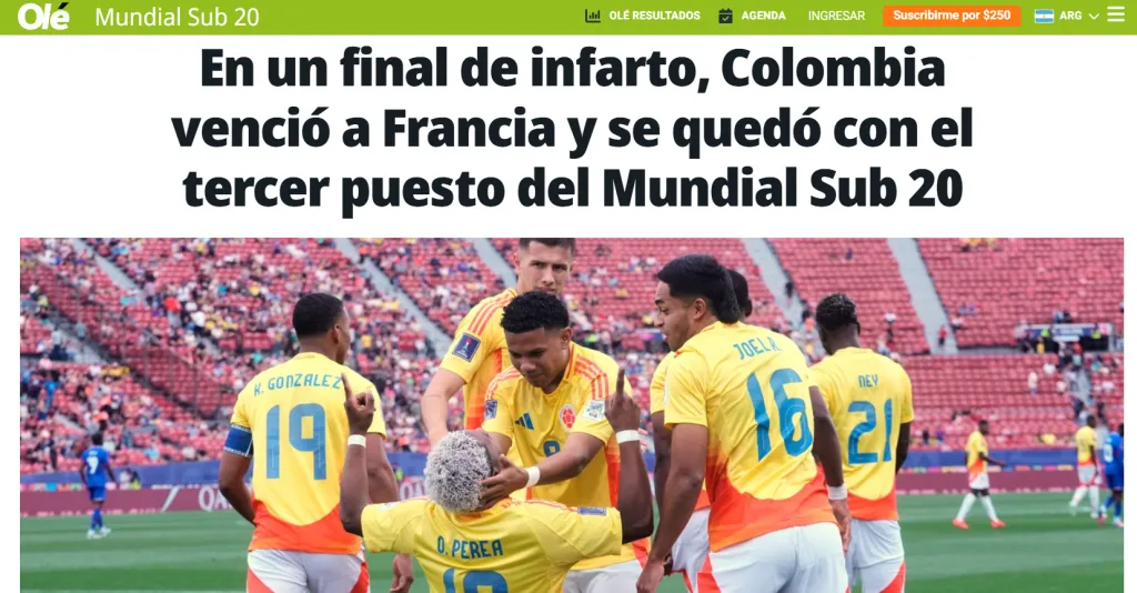 Al respecto, los que justamente se hicieron eco de lo que fue la victoria de Colombia 1 a 0 sobre Francia fueron los medios argentinos. ”En un final de infarto, Colombia venció a Francia y se quedó con el tercer puesto del Mundial Sub 20. Con un gol en el arranque del partido, los cafeteros le ganaron a Les Bleus y se quedaron con el premio consuelo”, apuntó el Diario Olé.