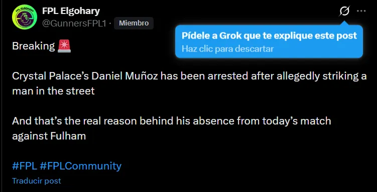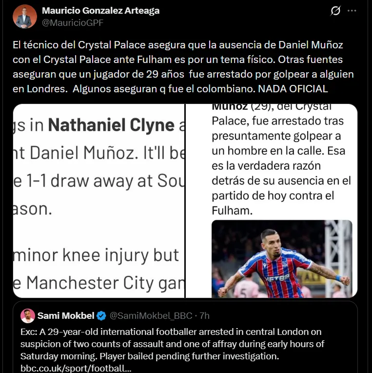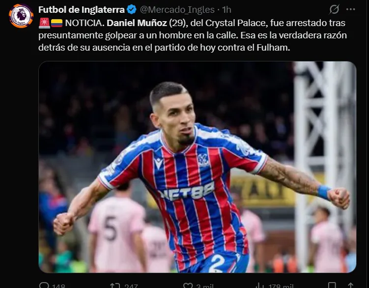 La información disponible señala que el futbolista, aún sin confirmar que fue Daniel Muñoz, fue detenido por un día y salió libre bajo fianza mientras la Policía realiza las respectivas investigaciones. El club Crystal Palace aún no ha emitido comunicado alguno.