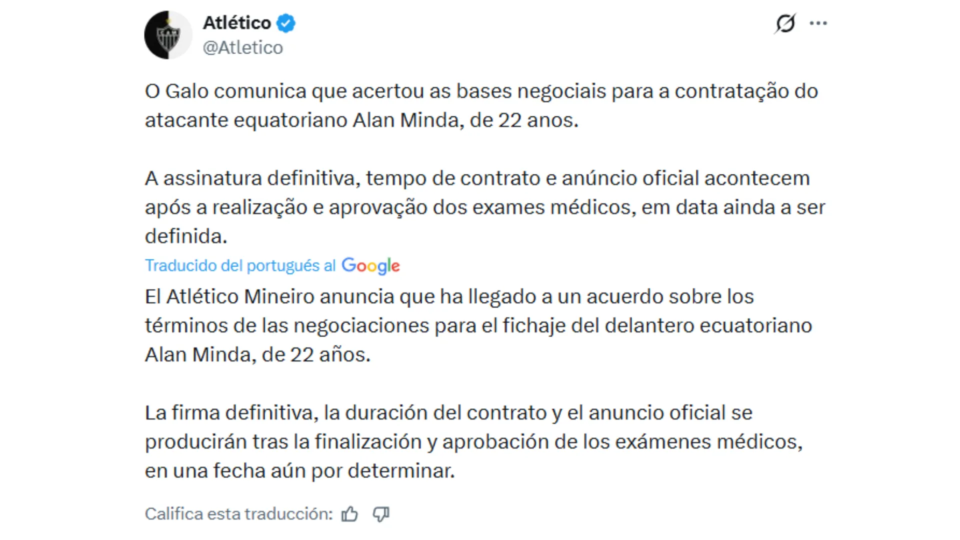 Atlético Mineiro reveló que los términos del nuevo contrato de Alan Minda se harán oficiales una vez que el jugador ecuatoriano pase todos los chequeos médicos y los respectivos exámenes físicos que se le deben hacer. El ecuatoriano ya estaría en Brasil para seguir este proceso.