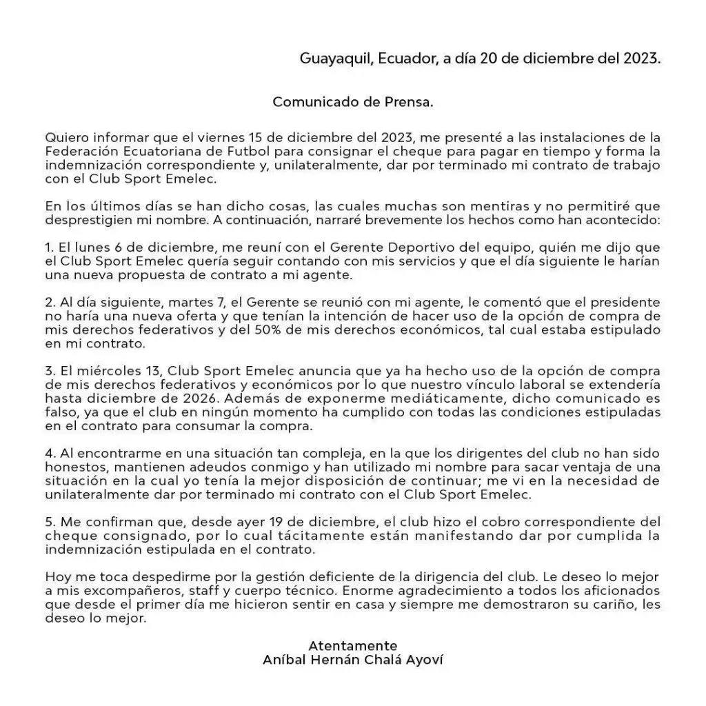 Emelec emitió un comunicado dando a conocer que Aníbal Chalá fue comprado definitivamente por los azules el 13 de diciembre. Ante esto el jugador explica que el comunicado es falso y que el equipo no cumplió todas las cláusulas para ejercer la compra.
