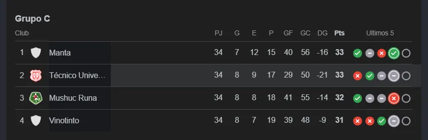 El cuadrangular de descenso parece que se decidirá en la última jornada, Manta FC ganó y salió del fondo de la tabla a ponerse en puestos de permanencia en la Serie A.