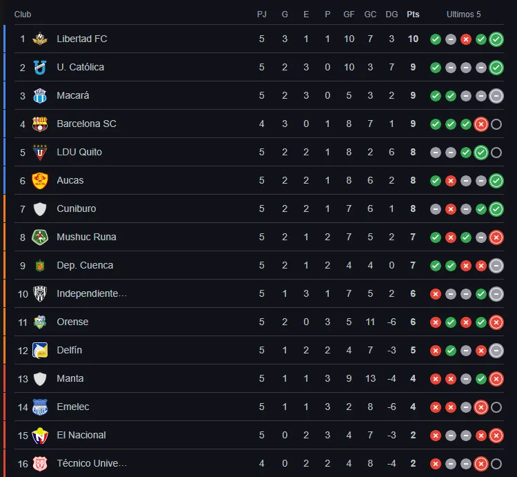 La sorpresa, por ahora, la está dando Libertad de Loja al estar puntero con 10 puntos. U. Católica, Macará y Barcelona son escoltas con 9 puntos, aunque los ‘toreros’ deben jugar su partido.