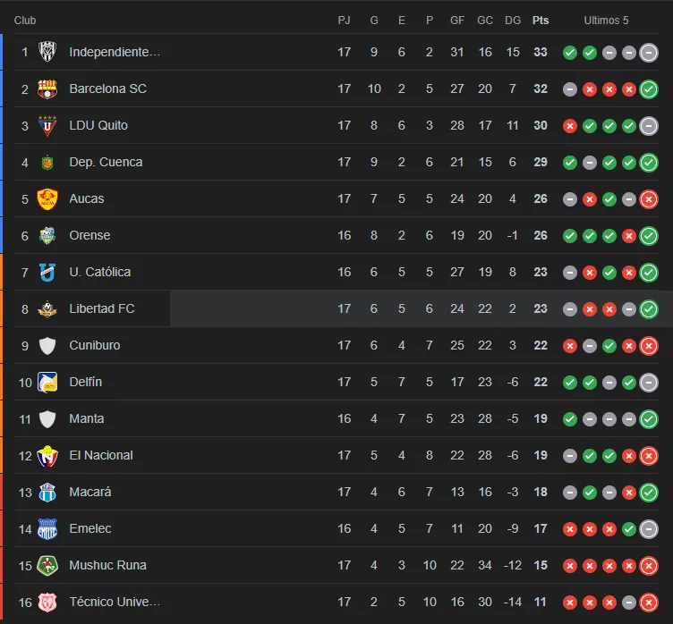 Independiente del Valle sigue puntero con 33 puntos, pero ya es solo 1 su ventaja por encima de Barcelona, así mismo los toreros sacan 2 puntos de ventaja sobre Liga de Quito.
