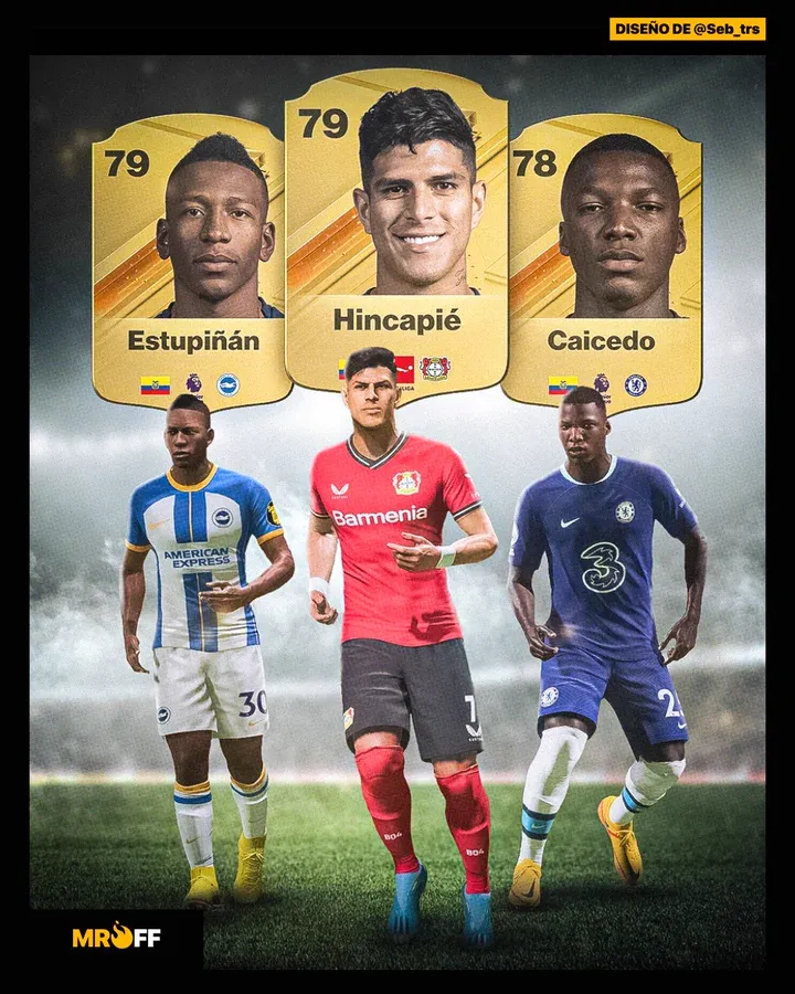 Piero Hincapié del Bayer Leverkusen, Moisés Caicedo del Chelsea y Pervis Estupiñán del Brighton son los tres mejores elementos en la versión virtual con scores de: 78 para el volante del Chelsea y 79 para nuestros compatriotas.
