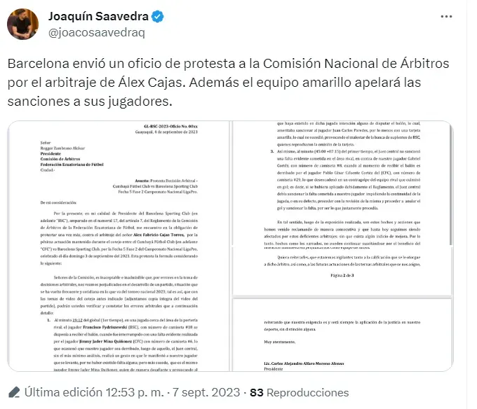 Este jueves 7 de septiembre de 2023 se pudo conocer que Barcelona SC ha pedido una sanción/castigo para el árbitro Álex Cajas, tras su partido ante Cumbayá.